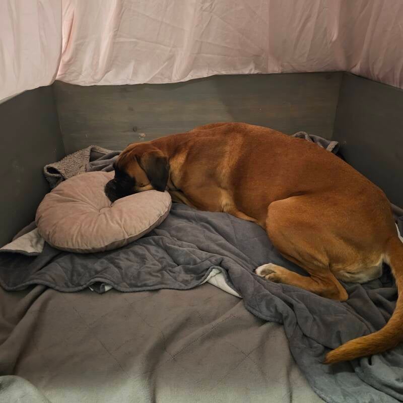 Heute ist die neue Matte für die Wurfbox gekommen, jetzt ist es unter den Decken noch mal weicher und Biras Kissen ist frisch gewaschen auch in die Box gekommen.