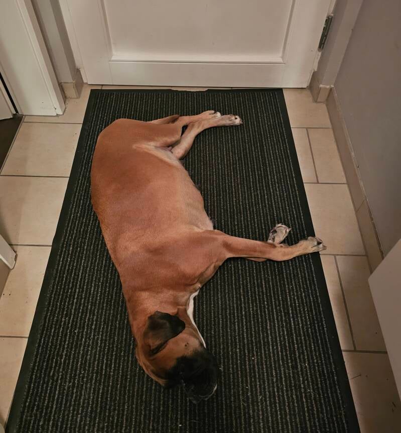 Ab und zu wird Bira das Sofa zu kuschlig 😉 dann geht es auf den Fußabstreifer