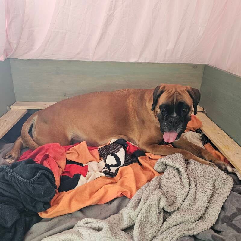 Bira baut immer wieder in ihrem Brennesselnest, und legt sich mal in ihre Wurfbox und mal in unser Bett.